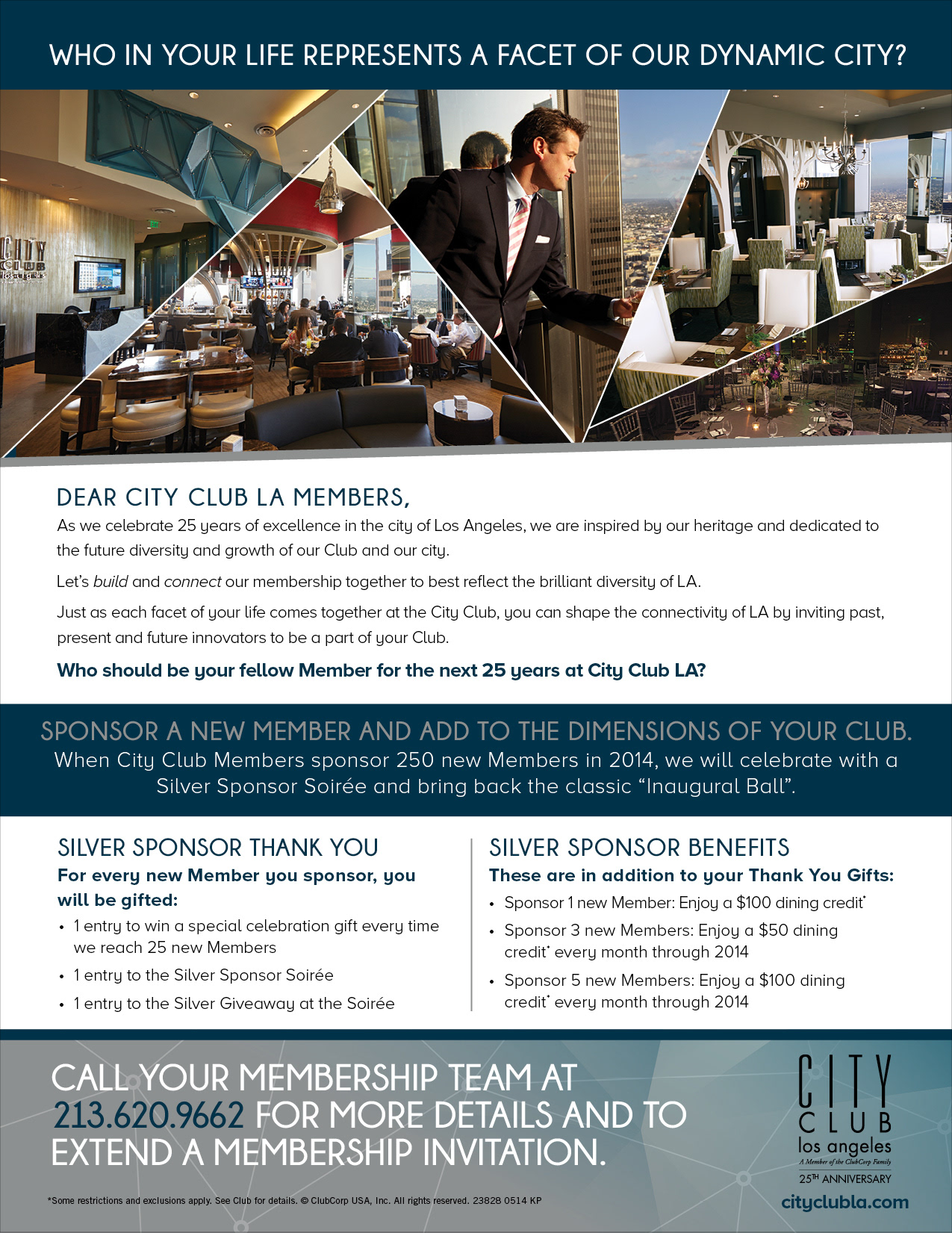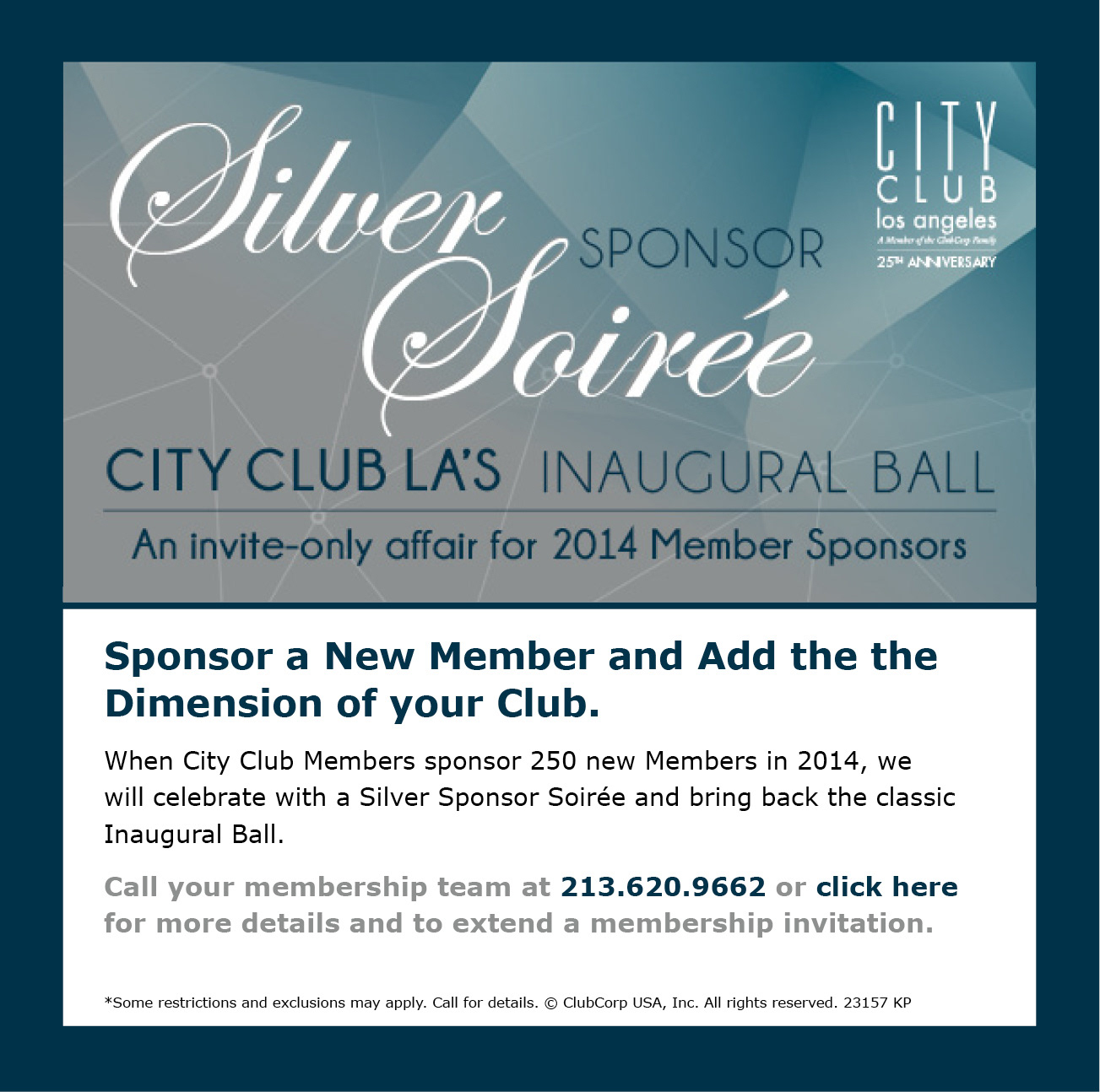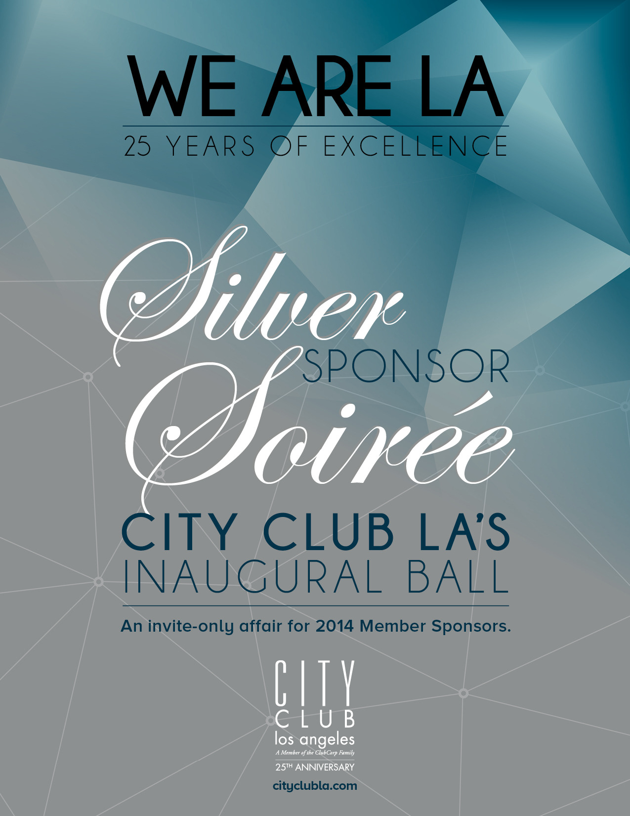 The Silver Soiree Campaign was designed for the City Club of Los Angeles. When City Club Members sponsor 250 new Members in 2014, we will celebrate with a Silver Sponsor Soirée ball.
